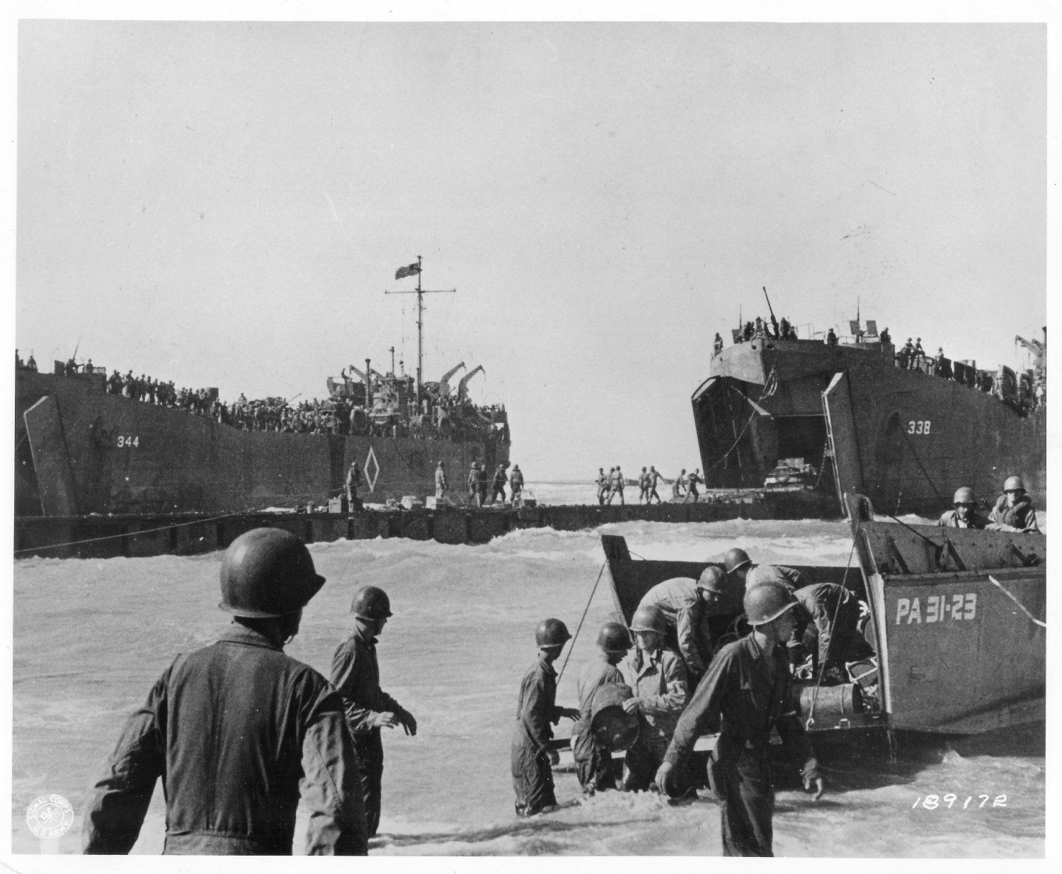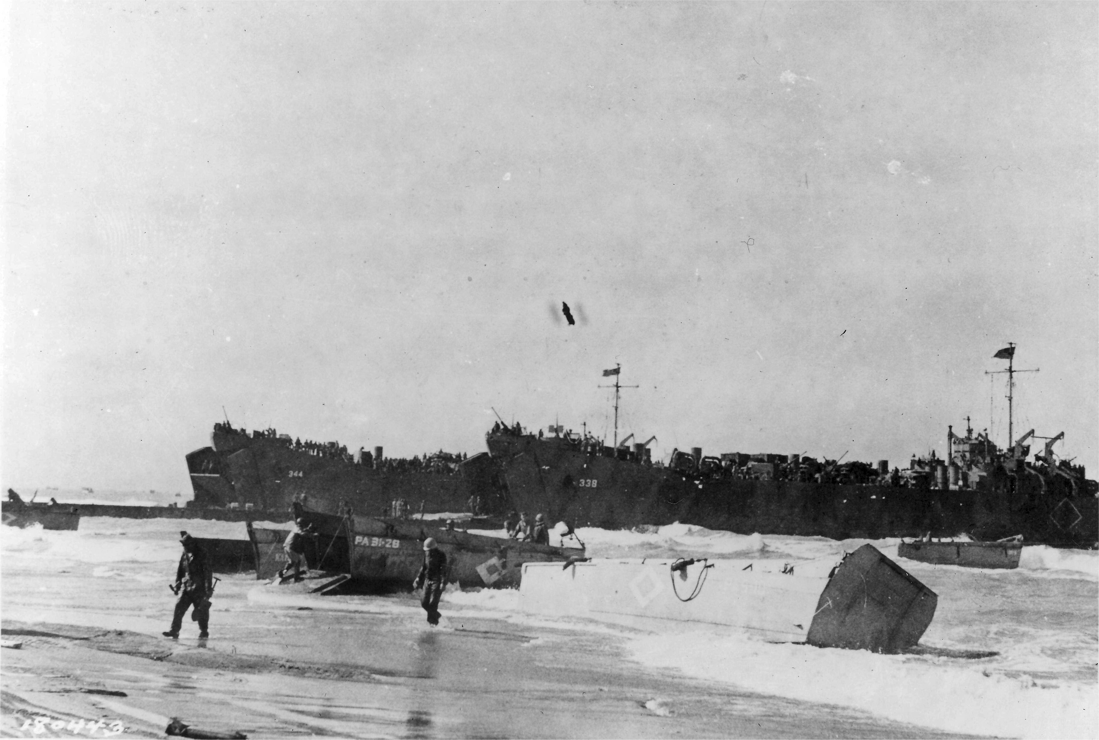 913k | USS LST-344, (left) and USS LST-338 (right) unloading troops and supplies on the Gela invasion beaches in Sicily on "D-Day", 10 July 1943. Broached LCVP at right is from USS Barnett (APA-5). Next LCVP to the left is from USS Monrovia (APA-31). Photographed by Paris. US Army Signal Corps photo # III SC 180443 from the US Army Signal Corps Collection now in the US National Archives. |