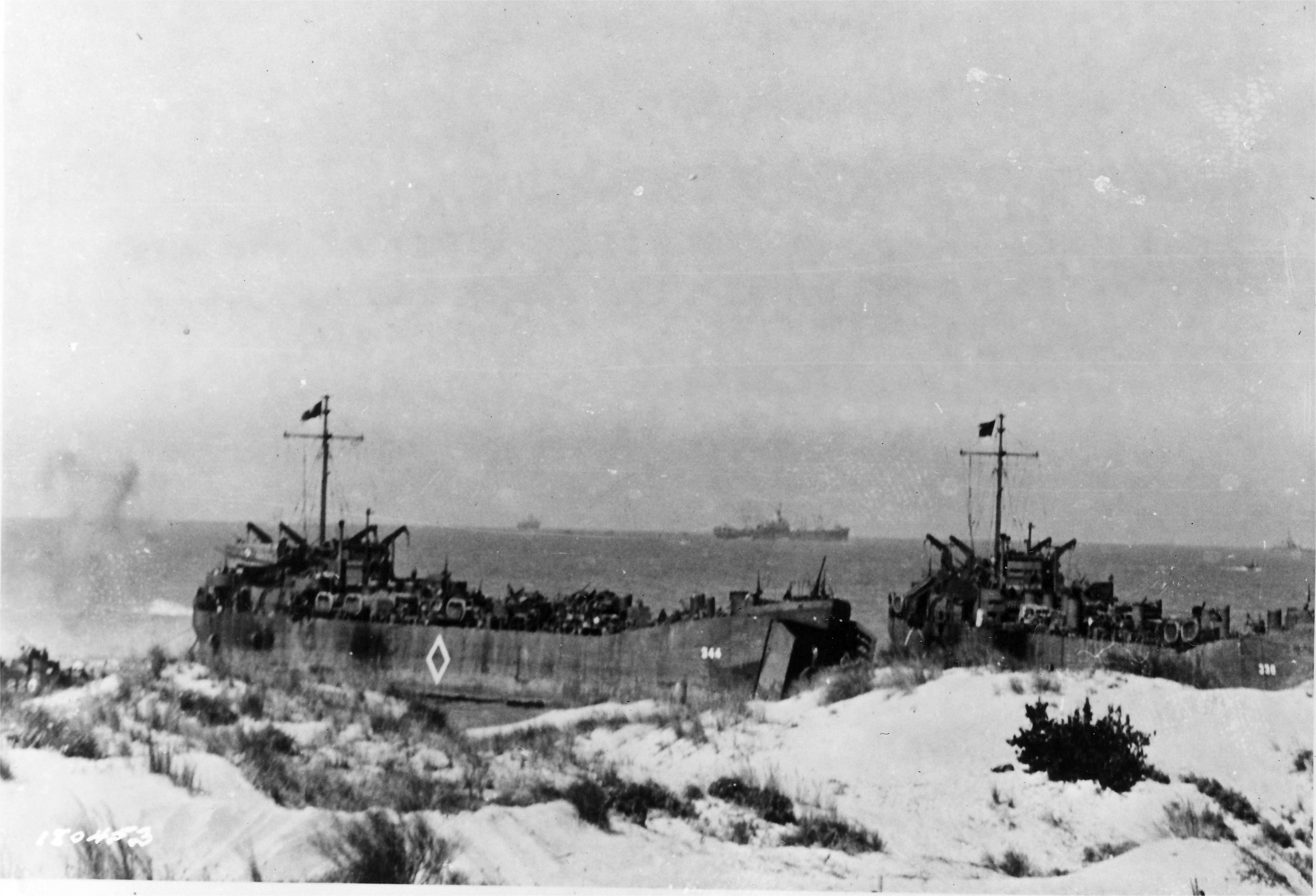 947k | USS LST-344 and USS LST-338 beached at the Gela beachhead in Sicily, 10 July 1943, while unloading men and materials.