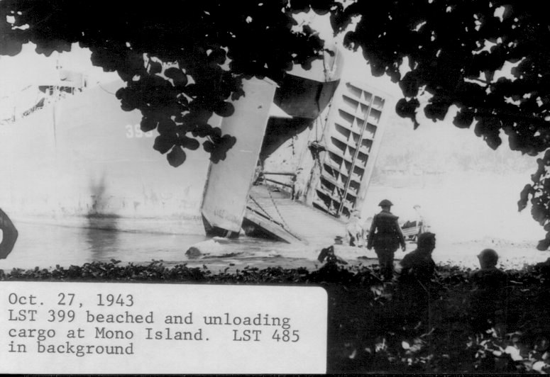 75k | USS LST-399 beached and loading cargo at Mono Island, Treasury Islands, Central Solomon Islands, 27 October 1943 | Photo by William E. Jayne USS LST-399 | |