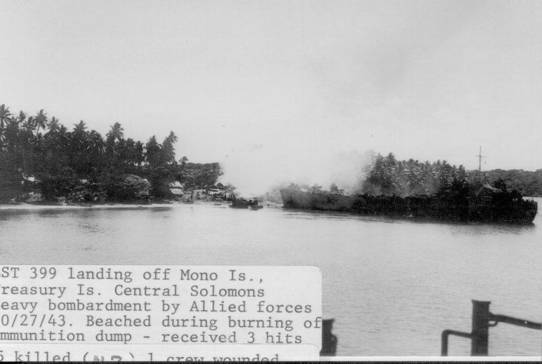 54k | USS LST-399 during heavy bombardment by Allied forces while landing off Mono Island, Treasury Islands, Central Solomons, 27 October 1943 | Photo by William E. Jayne USS LST-399 | |