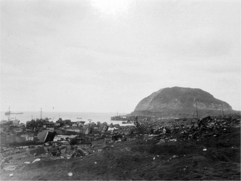73k | USS LST-588, USS LST-399, USS LST-390, LCT-1326 and other amphibious ships and landing craft on the beach at Iwo Jima, February 1945. Note: Mount Suribachi in the background. | USS LSM / LSMR Association | |