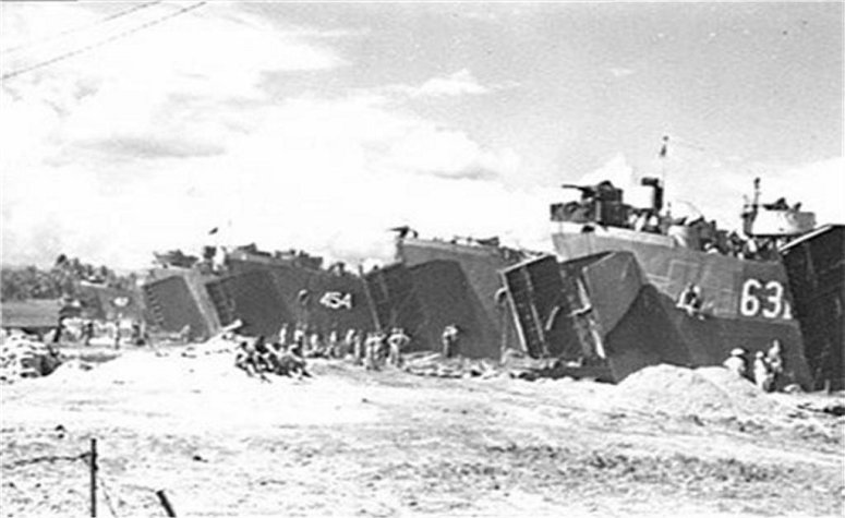 USS LST-22 unload US Army troops on the Luzon beachhead on invasion day, 9 January 1945. A row of LSTs unload men and armaments