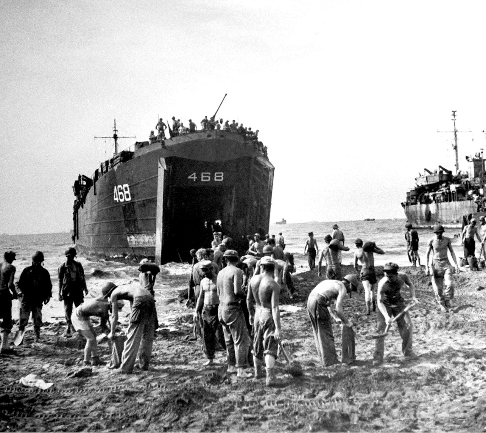 132k | USS LST-468 being unloaded by hand at Morotai, September-October 1944. US Naval History and Heritage Command Photo # 84854. Courtesy of William H. Davis, 1976 | US Naval History and Heritage Command | |