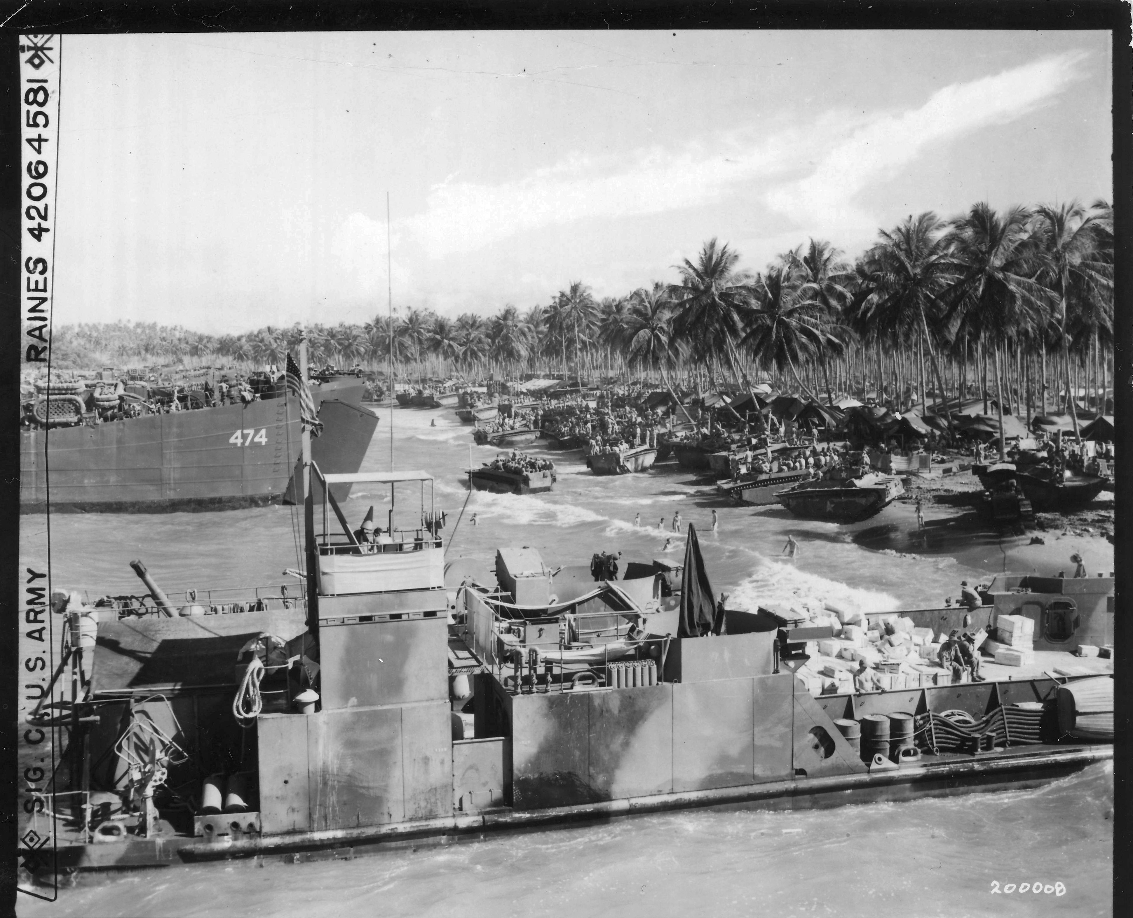 125k | Cape Gloucester Invasion, December 1943. Loading LSTs at Oro Bay, New Guinea, on December 24, 1943, in preparation for the Cape Gloucester