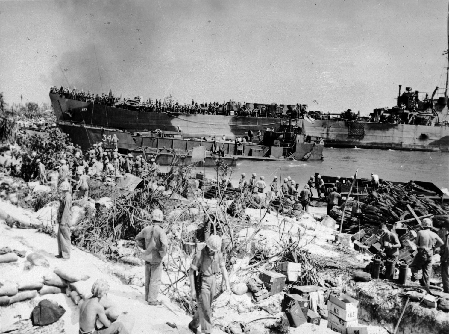 390k | USS LST-477 and LCT(5)-346 bringing seabees and supplies to Kwajalein Atoll, Marshall Islands in February 1944.