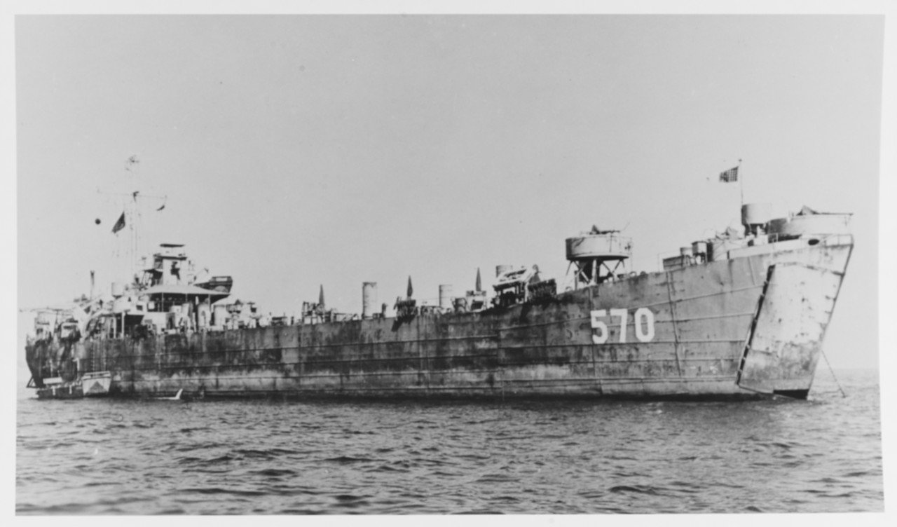 105k | USS LST-570 at anchor, circa 1945, location unknown. US Naval History and Heritage Command Photo # NH 74308 |
