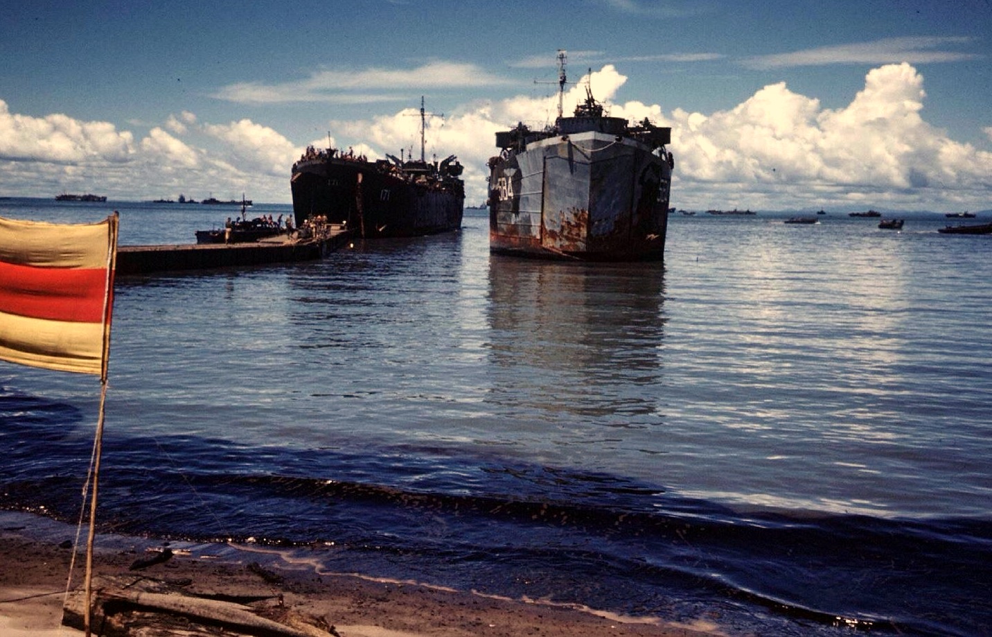 351k | USS LST-584 and USS LST-590 beached on Red Beach, Tarakan Island while unloading, 1 May 1945. | Carl Kracht for his father PHom1/c Ken Kracht | |