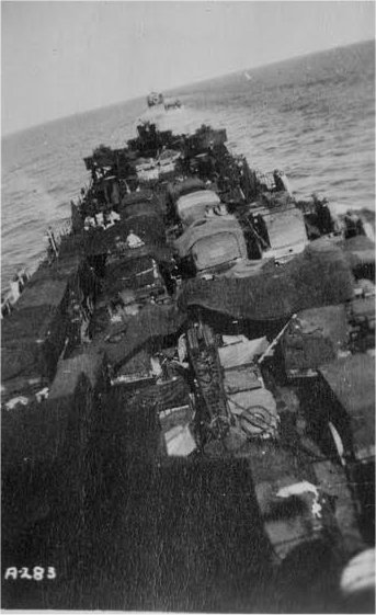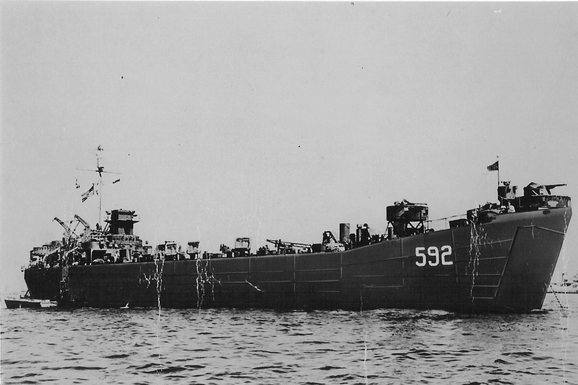 42k | USS LST-592 underway loaded with a deck cargo of vehicles, date and location unknown. | Kelly McCrystle for his grandfather Ernie Osburn USS LST-1081 | |