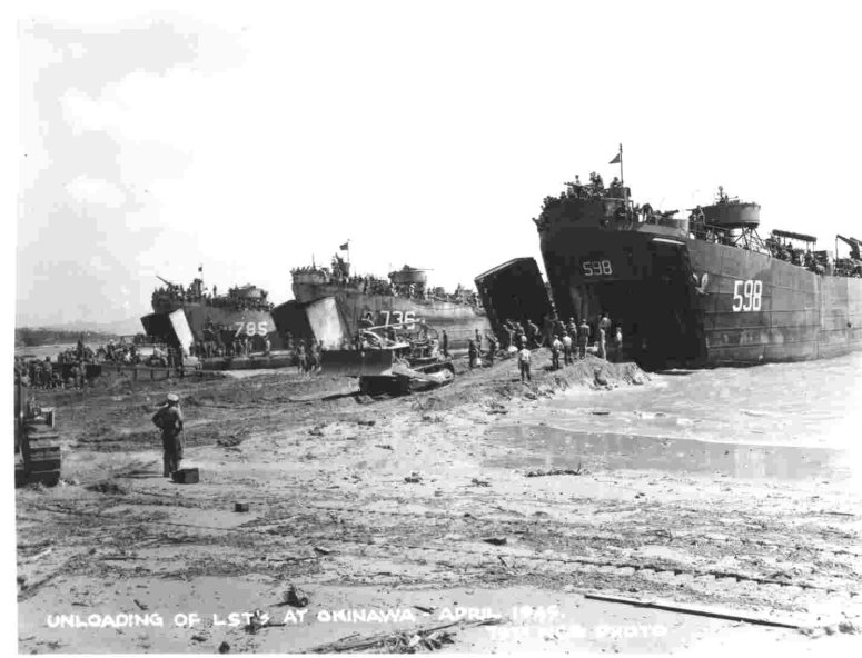 81k | From left to right USS LST-785, USS LST-736 and USS LST-598 unloading while beached at Okinawa, April 1945. A US Navy photo from the collections of the US Naval Historical Center. |