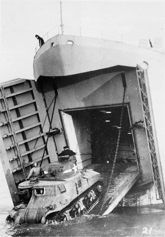 133k | USS LST-606 beached while off-loading tanks, date and location unknown. | Colleen Holth for her father Clifford Roger Burnham GMC/2c USS LST-606 | |