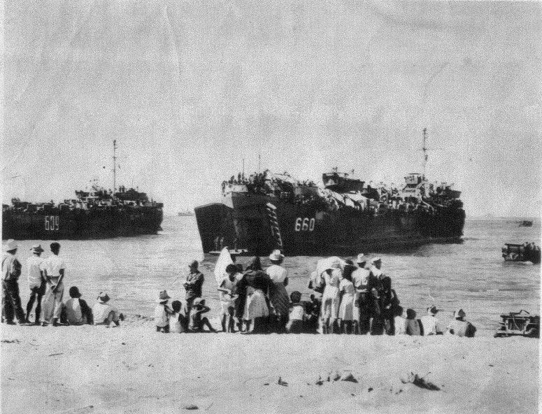 numberous other LSTs beached at Mindoro Island disgorging their vital cargoes of men and material, completing the over water movement from Leyte of 600 miles to seize the dominant beaches along the