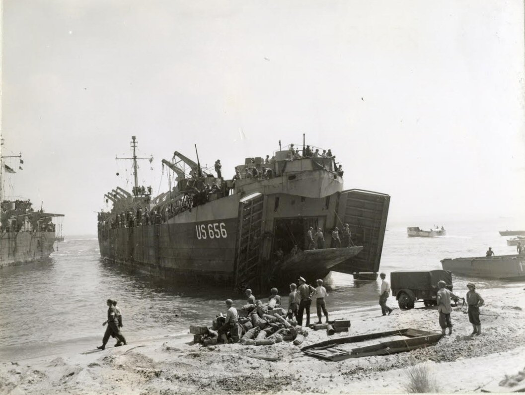 130k | USS LST-656 beached beached in southern France, circa August or September 1944.