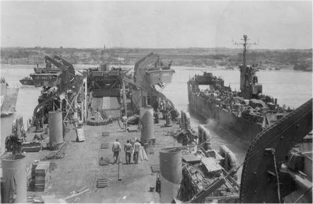 37k | USS LST-660 beached on a ramp with two unidentified LSTs, date and location unknown. Note the unidentified LSM alongside to starboard. | Photo by H. Fiorella GM2/c USS LST-660 submitted by his grandson Phil Lobato | |