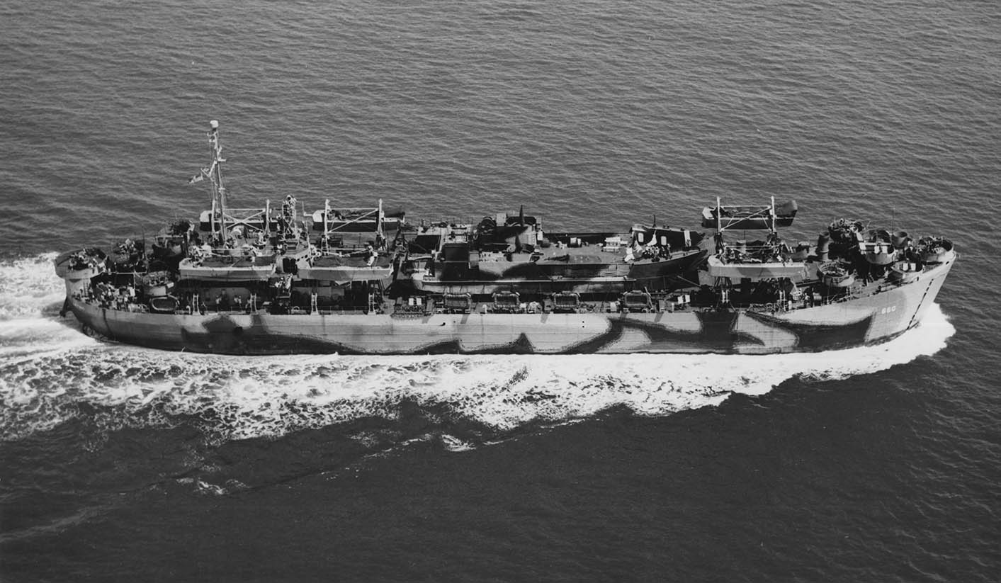 156k | USS LST-660 under way, 19 May 1944, in the Gulf of Mexico, probably enroute for the Pacific. Note the unidentified Landing
