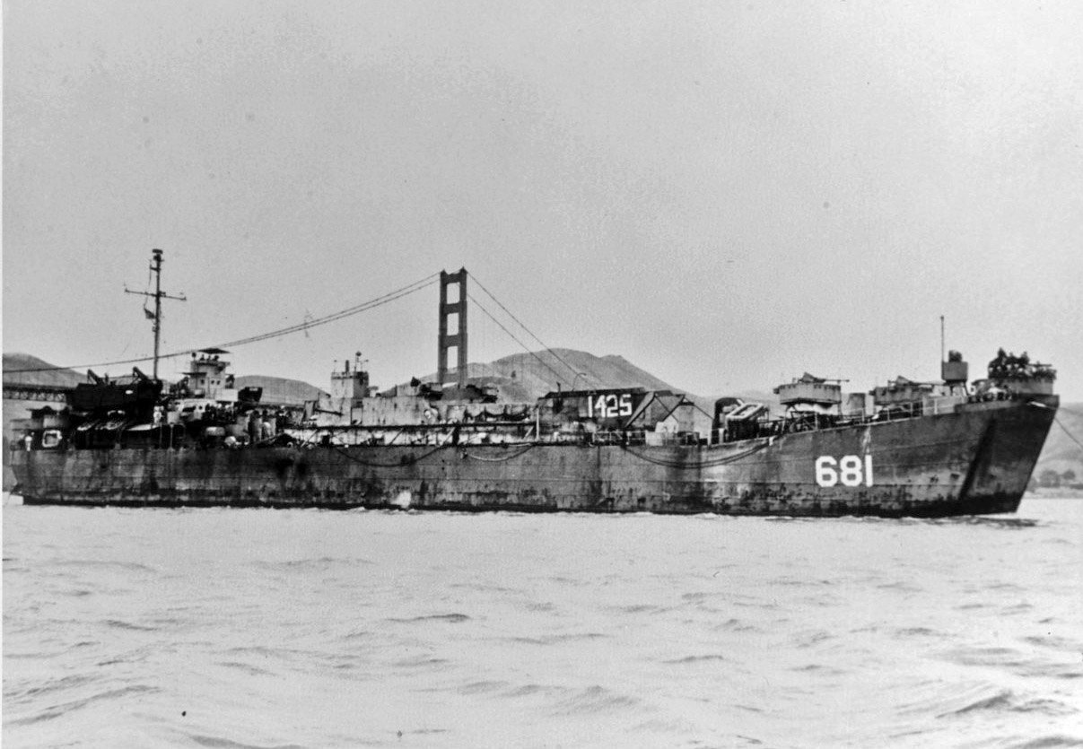 158k | Homeward bound USS LST-681 passing under the Golden Gate Bridge as she enters San Francisco Bay with