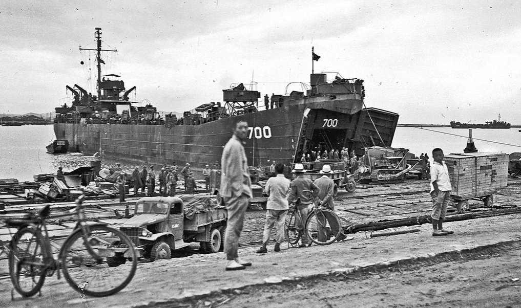 USS LST-700 is unloading trucks of the First Signal Corps laboratory and personnel of General Headquarters advanced echelon.