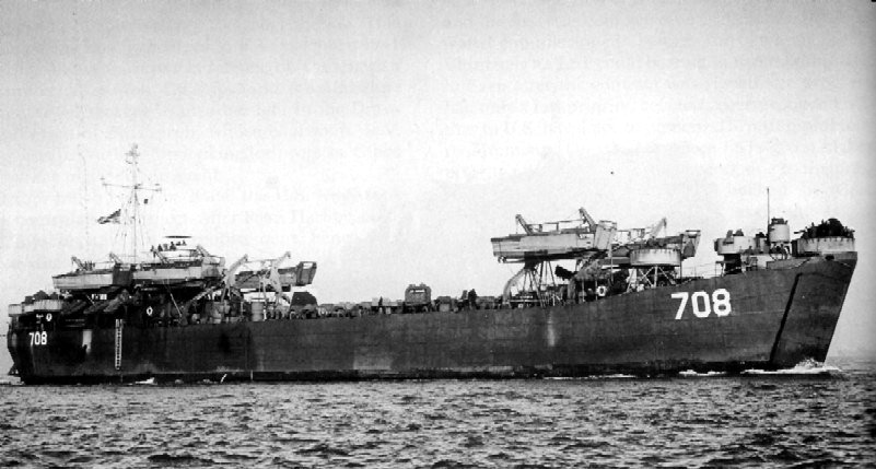 73k | USS LST-708 underway, in the Pacific. Note the six davits for LCVPs that have been fitted so that she could function as a semi-attack transport. Text and photo from " U.S. Amphibious Ships and Craft: An Illustrated Design History" by Norman Friedman. |