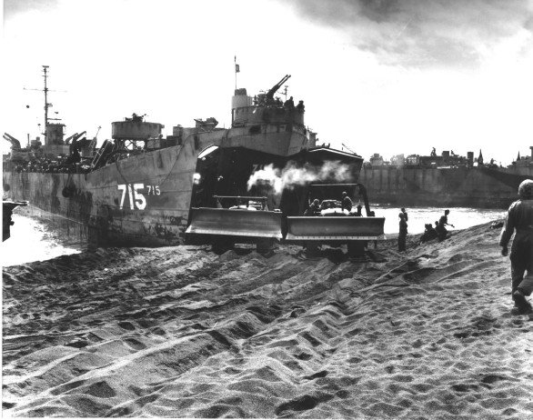USS LST-715 unloading supplies on the beach of embattled Iwo Jima among the wreckage left
