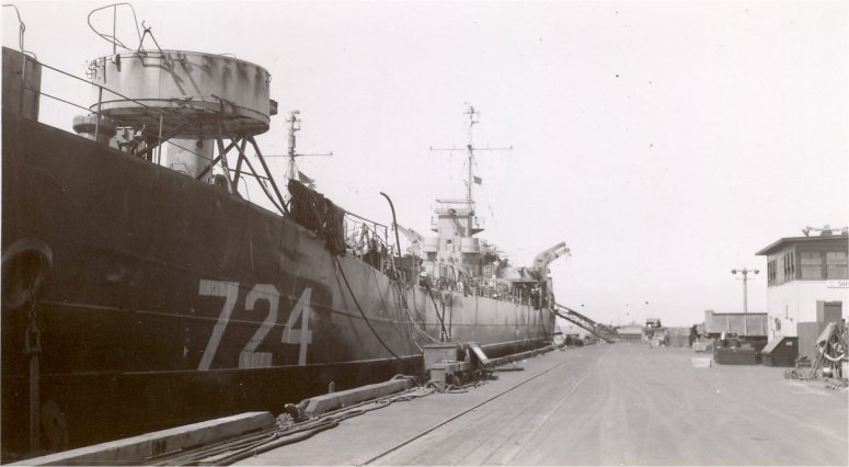 48k | USS LST-724 moored pierside, at San Francisco Naval Shipyard, Hunters Point, 24 June 1946 while being prepared for storage as part of the reserve fleet. | Photo by Donald Kronish, submitted by Jon Strupp | |