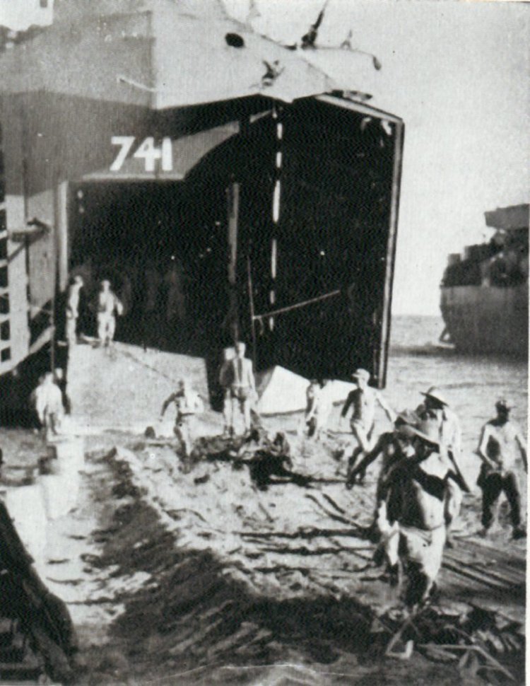 62k | USS LST-741 beached at Morotai, Halmahera Islands, Netherlands East Indies, 18 September 1944 while Royal Australian Air Force troops from No. 14 Airfield Construction Squadron disembark. Australian War Memorial photo # OC1641 |