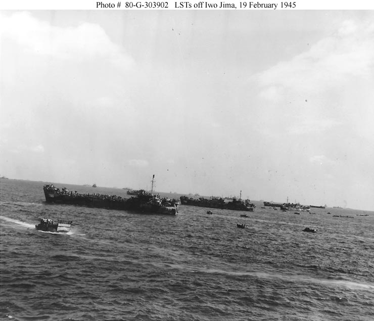 63k | LSTs and other shipping in the transport area off Iwo Jima on the initial day of landings, 19 February 1945.