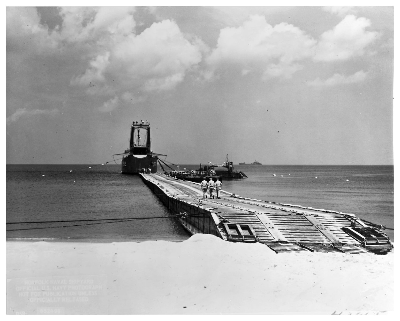 171k | USS Mahnomen County (LST-912) married to a causeway during tests of the LST-1179 class bow ramp gear, 1965.