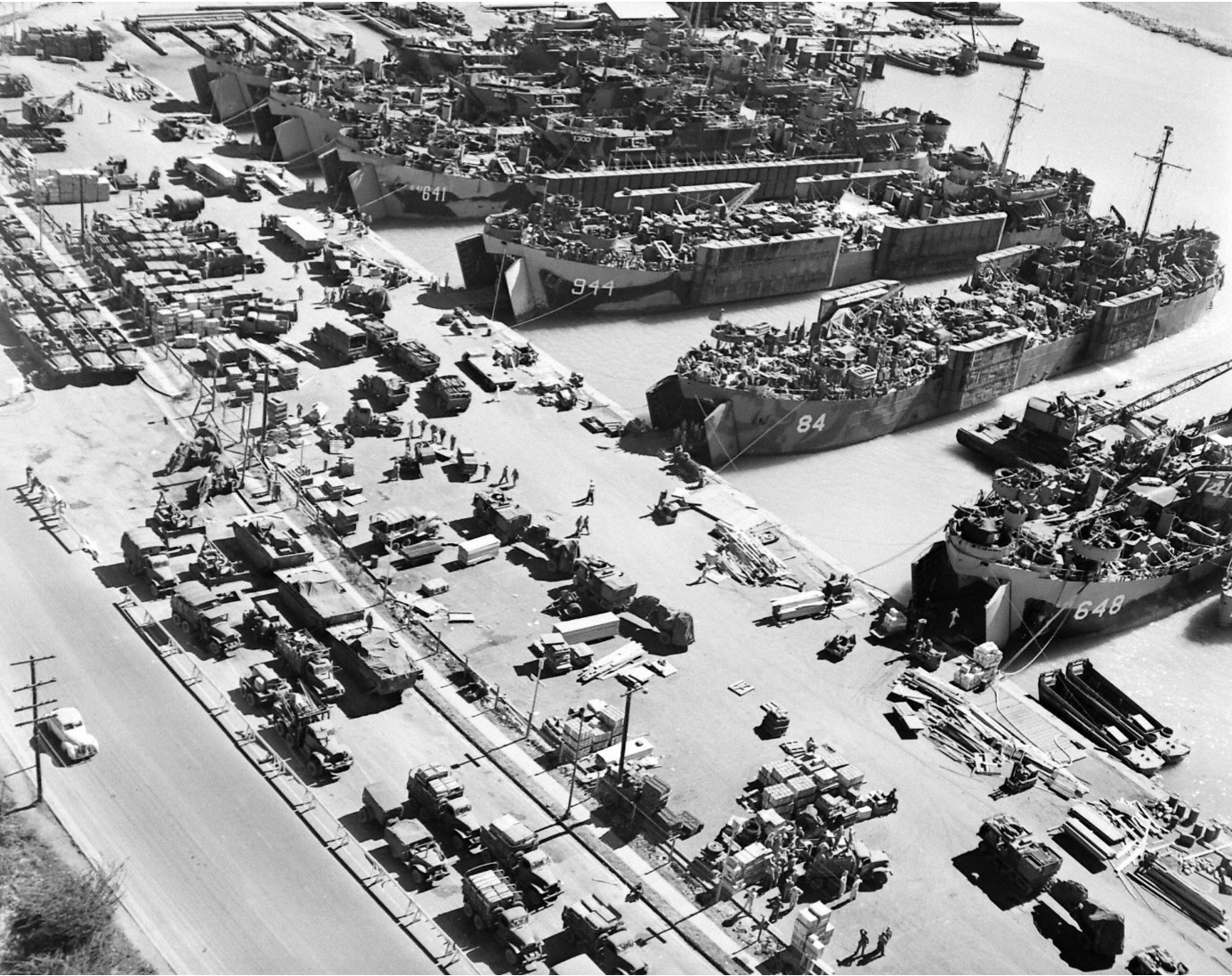 2336k | Six LSTs loading for their next combat operation moored at Naval Station Pearl Harbor, between 8 December 1944