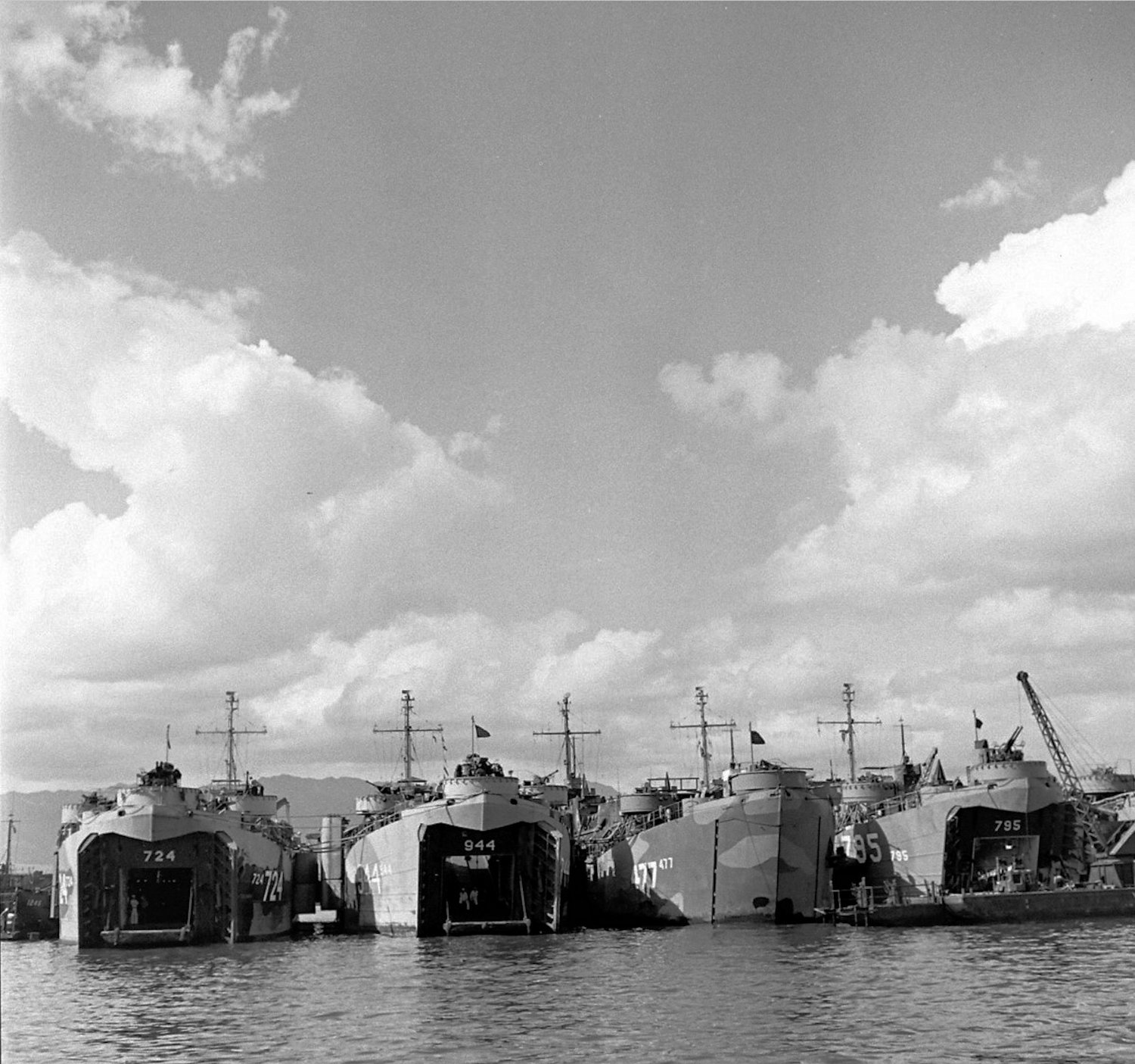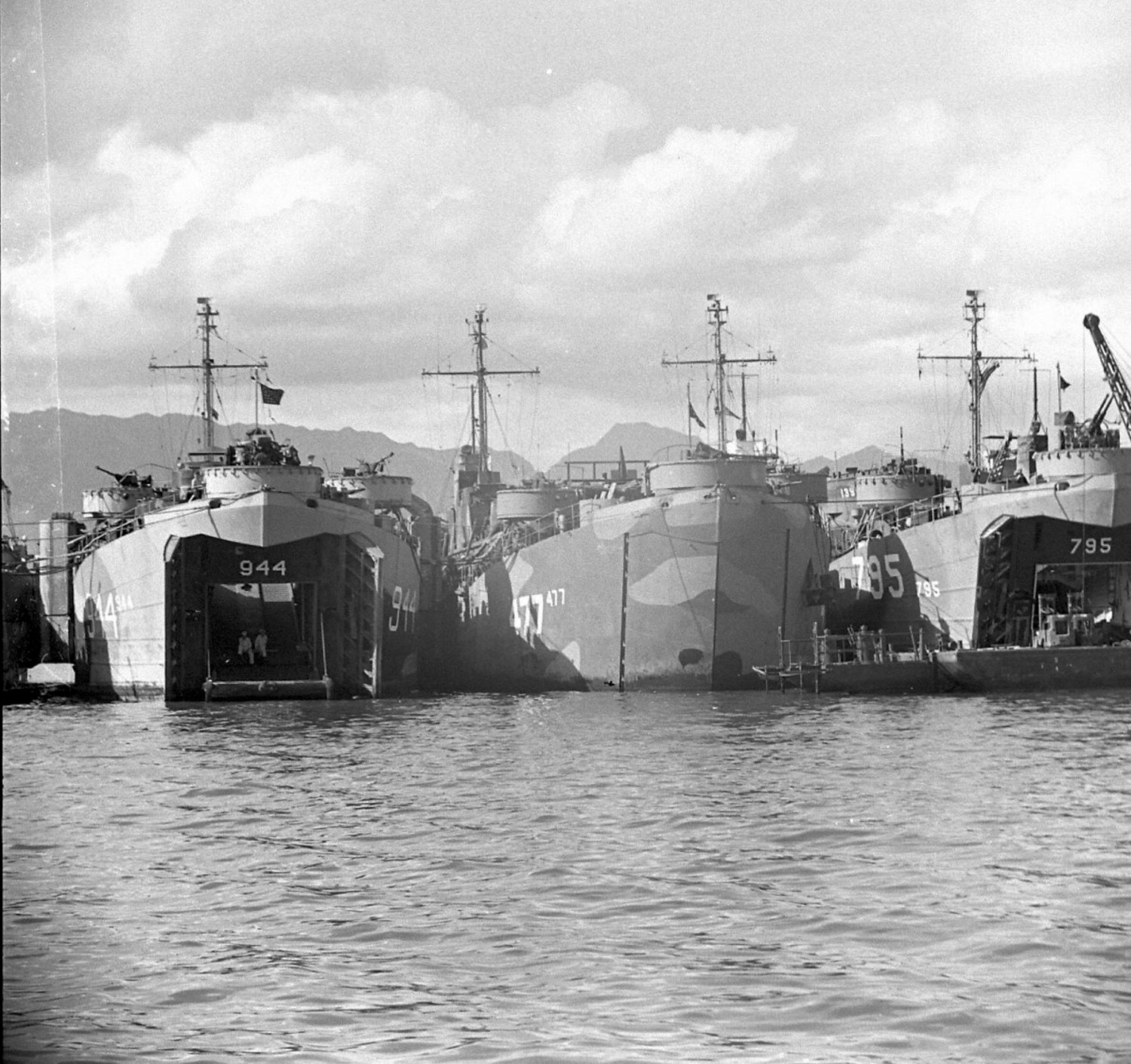 USS LST-795 moored Naval Station Pearl Harbor between 8 December 1944 and 22 January 1945 undergoing training during the build up for Operation Detachment, the Assault and