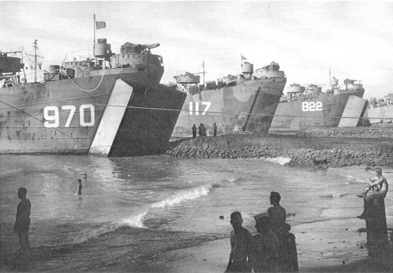 267k | USS LST-970 seen here beached after unloading her cargo along with LST-117 and LST-822 at Leyte, 12 September 1945. | LT William (Bill) S Barnes | |
