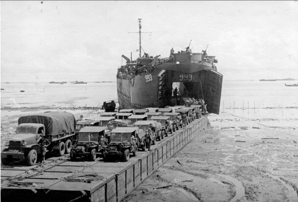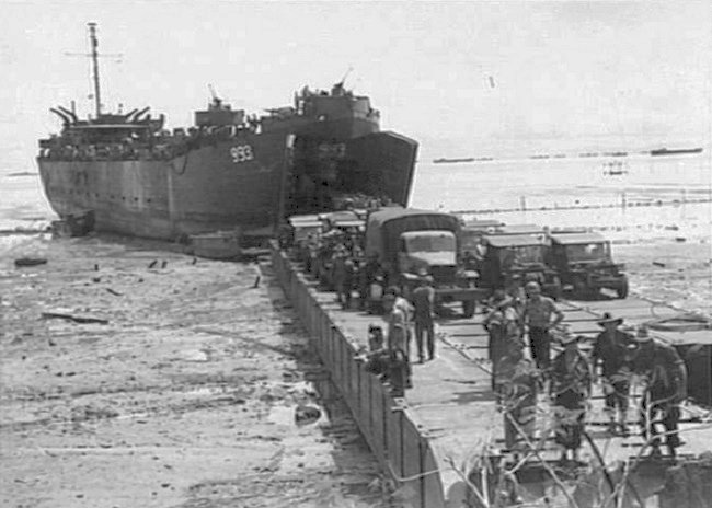 26k | USS LST-993 off loading vehicles onto a pontoon causeway probably at Tarakan, Borneo, circa May 1945. | LST Home Port Web Site | |