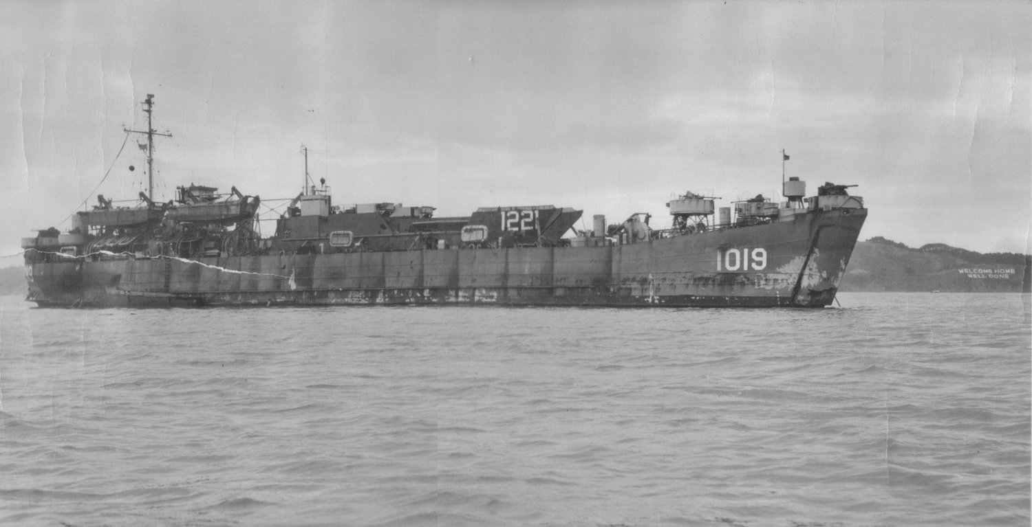 138k | USS LST-1019 with LCT(6)-1221 loaded on her main deck at anchor in San Francisco Bay, circa April-May 1946. LST-1019 had recently returned from the Asiatic-Pacific Theater. Note the Homeward Bound Pennant flying from the starboard yardarm. | ©Jim Kelleher III for his father ENS. James H. Kelleher, USNR CO LST-1019 | |