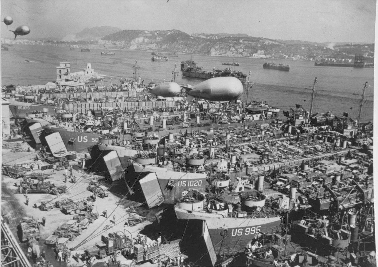 239k | Southern France Invasion, August 1944. LST's loading invasion supplies and vehicles at Nisida, Italy, 9 August 1944, just prior to the