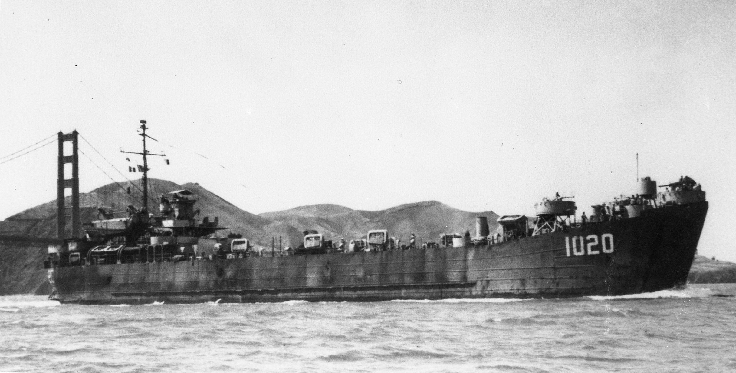 448k | USS LST-1020 underway while entering San Francisco Bay returning from duty in the Far Ease, circa 1946 flying "Homeward Bound" pennant. Vallejo Naval & Historical Museum | Darryl Baker | |