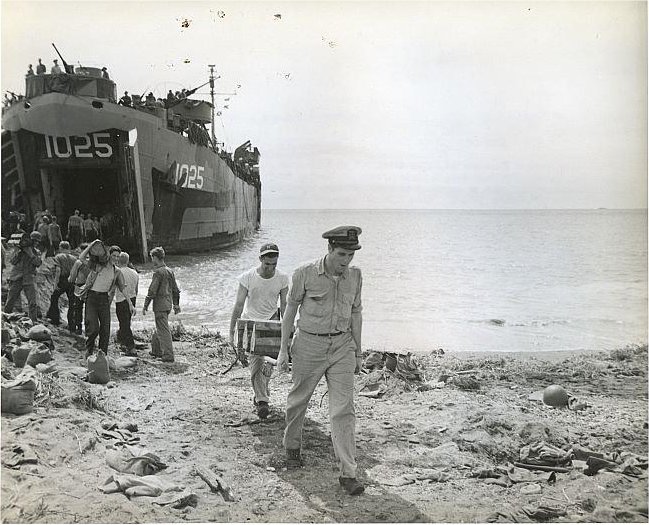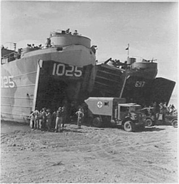 25k | USS LST-1025 and USS LST-697 beached on Blue Beach at Morotai, 17 May 1945. USS LST-1025 is unloading wounded from Tarakan Island. Members of the Australian Army 2/12 Field Ambulance Transferred them to the 2/5 General Hospital. | Australian War Memorial | |