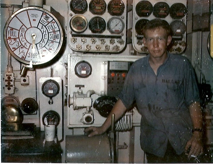 USS Pulaski County (LST-1088) engine room main control, EN3 Ballard at throttle, 1967. |