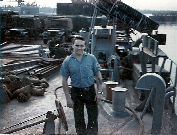 Several USS Pulaski County (LST-1088) unidentified crew members on deck as the ship was entering the mouth of the Makong River in 1967. |