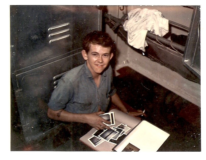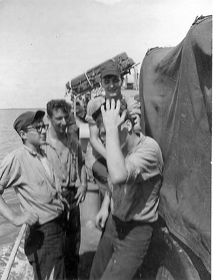 USS Pulaski County (LST-1088) crew members in the barracks at Sasebo, Japan, waiting for the ship to be stripped of guns and military equipment. Second from right is identified as Martin. |