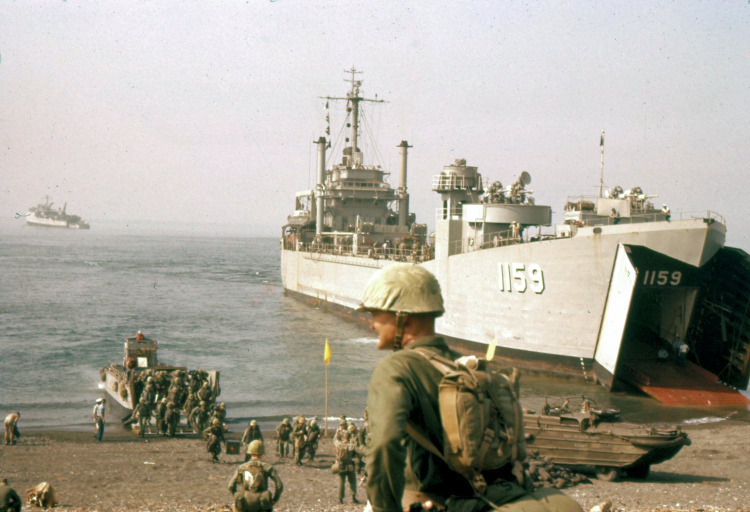 234k | USS Tom Green County (LST-1159) beached at Okinawa in 1961. Note unidentified LSD in background, and Marines disembarking from