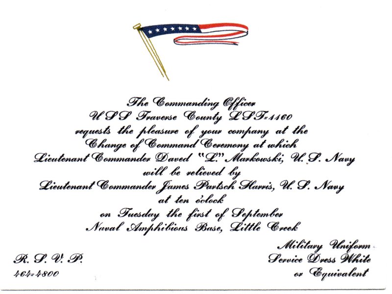 USS Traverse County (LST-1160) Change of Command invitation, 1 September 1970, LCDR Markowski relieved by LCDR Harris. |