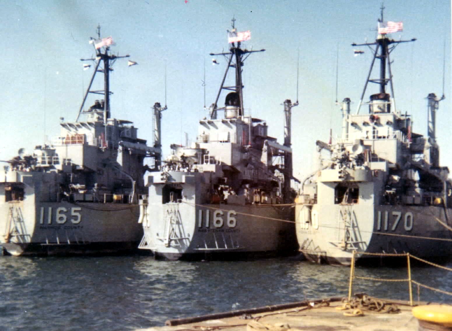 179k | From left to right; USS Washoe County (LST-1165), USS Washtenaw County (LST-1166) and USS Windham County (LST-1170) moored at Naval Station Yokosuka, Japan, January 1970. | Bob Morrison EN2 USS Washoe County | |