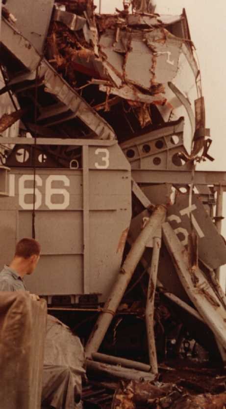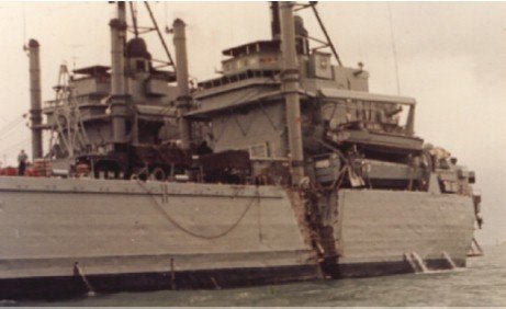 32k | Damage to USS Washtenaw County (LST-1166) as a result of collision with SS Kota Selatan, Hong Kong, 1970 | Sources, South China Morning Post & Greg Pierceall Contributed by Joe Radigan MACM USN Ret |