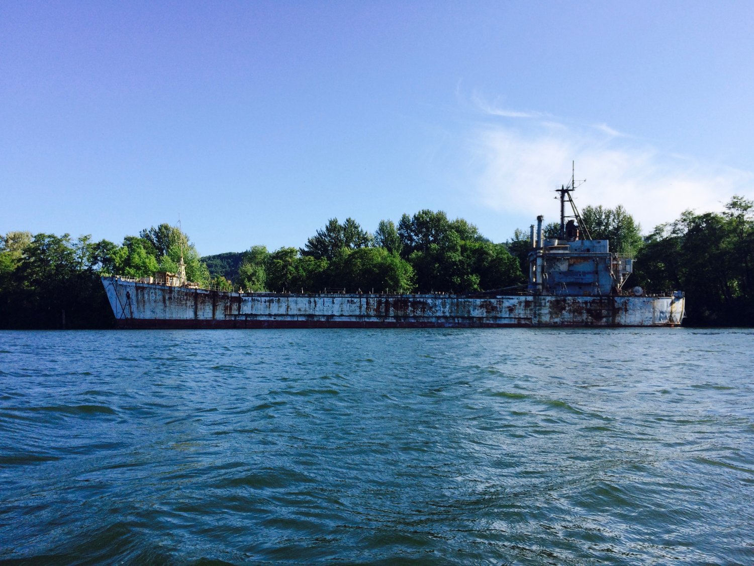 376k | Ex-USS Washtenaw County (LST-1166) moored along the Columbia River about 4 miles west of Rainier Oregon on the mainland Oregon shore, 21 June 2016. | Photos by Harvey Golden | |