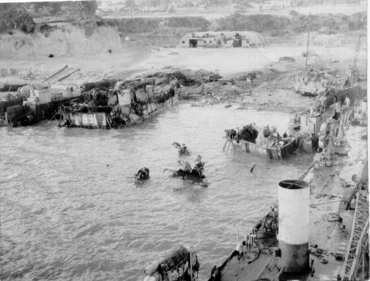 USS LST-355, USS LST-783, LCT(5)LCT-141, LCT(6)LCT-560 (destroyed), LCT(6)LCT-891, and LCT(6)LCT-785. Offshore is USS LST-920, which had been beached between the other two LSTs at the time of the explosion. US Naval History and Heritage Command photo # NH 76149. Courtesy of Lieutenant Commander Frank L. Howard (Ret.) |