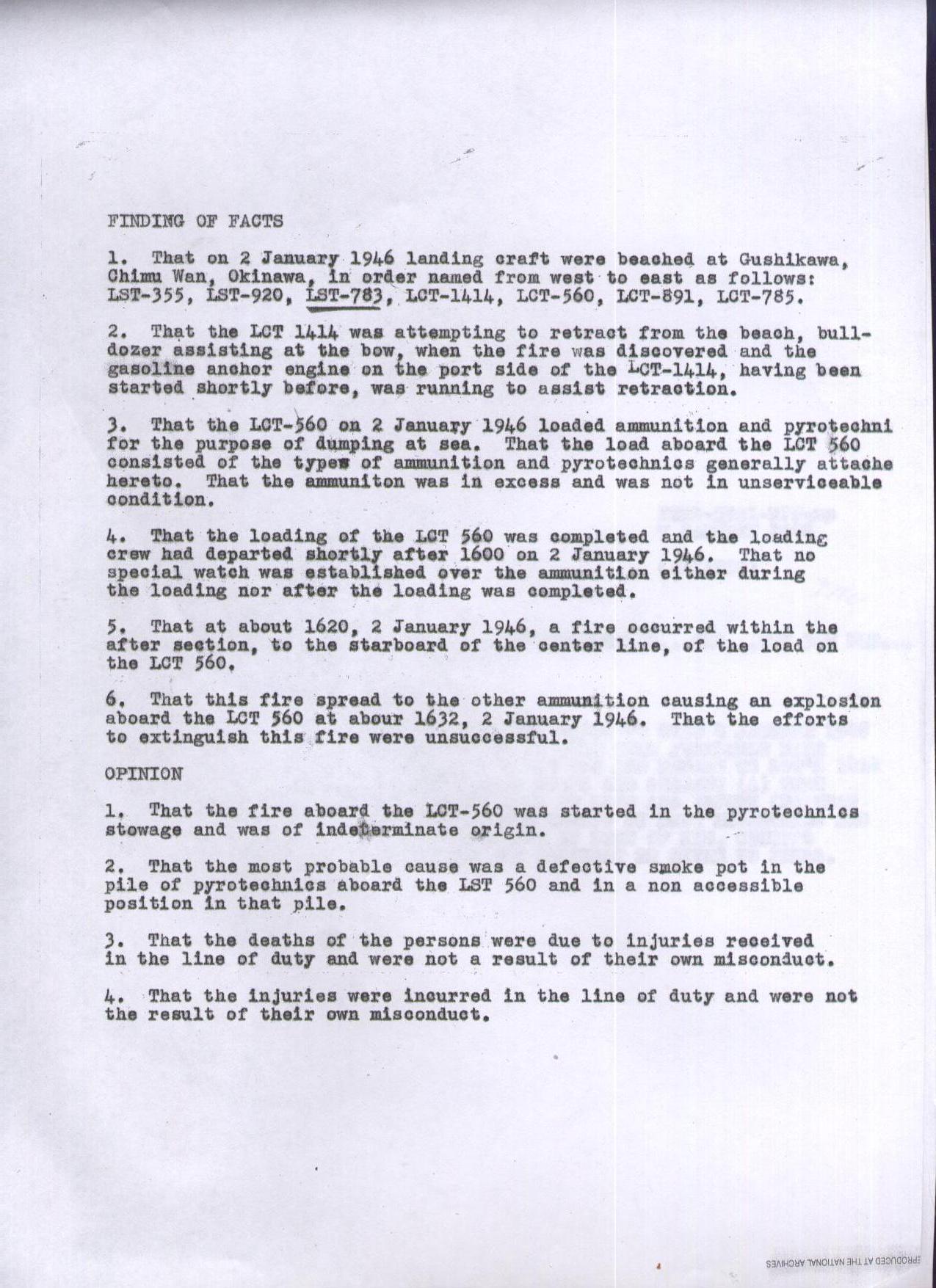 289k | Finding of Facts pertinent to the 2 January 1946 fire and explosion at Gushikawa, Chimu Wan, Okinawa of