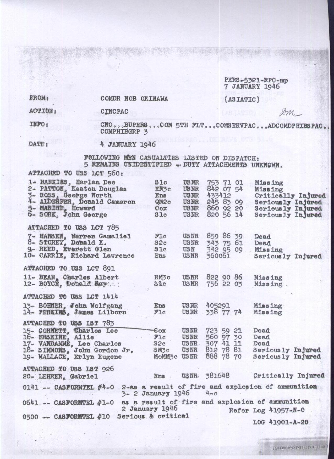 USS LST-926 US Navy letter from Commander NOB Okinawa to CINCPAC, dated 7 January 1946 now in the collections of the US National Archives. |