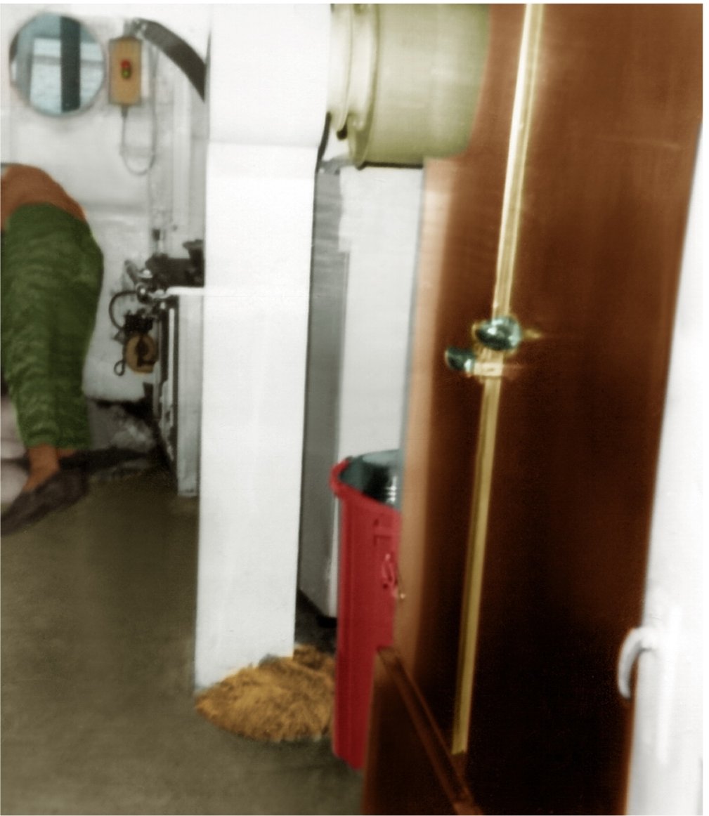 Mick McCammond cleaning up after the YFU-4's galley sink overflowed. |