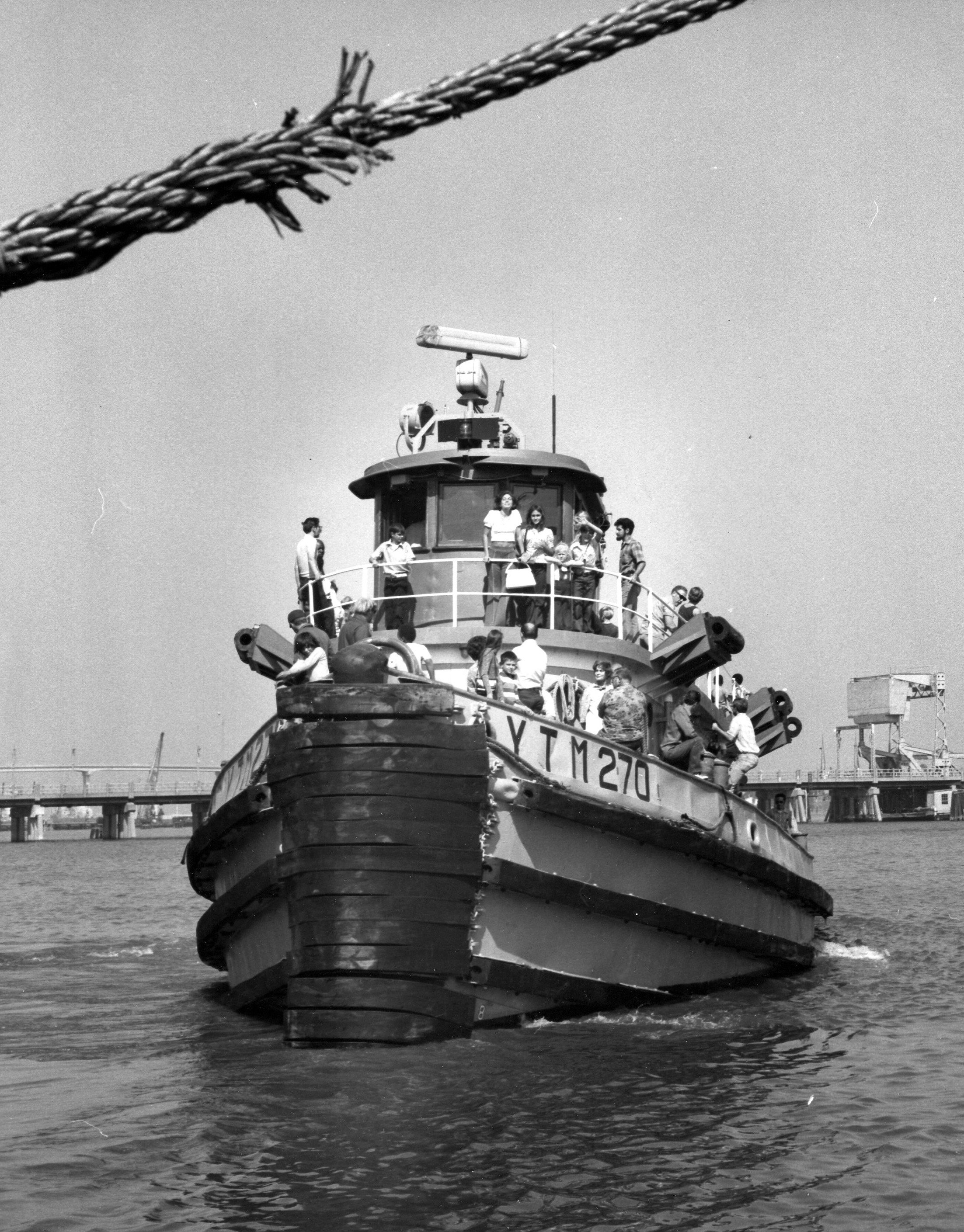1566k | Satanta (YTM-270) underway during Navy Day celebrations at Mare Island, 13 October 1973. Satanta was providing rides for civilian visitors. US Navy photo from the collections of Vallejo Naval and Historical Museum. |
