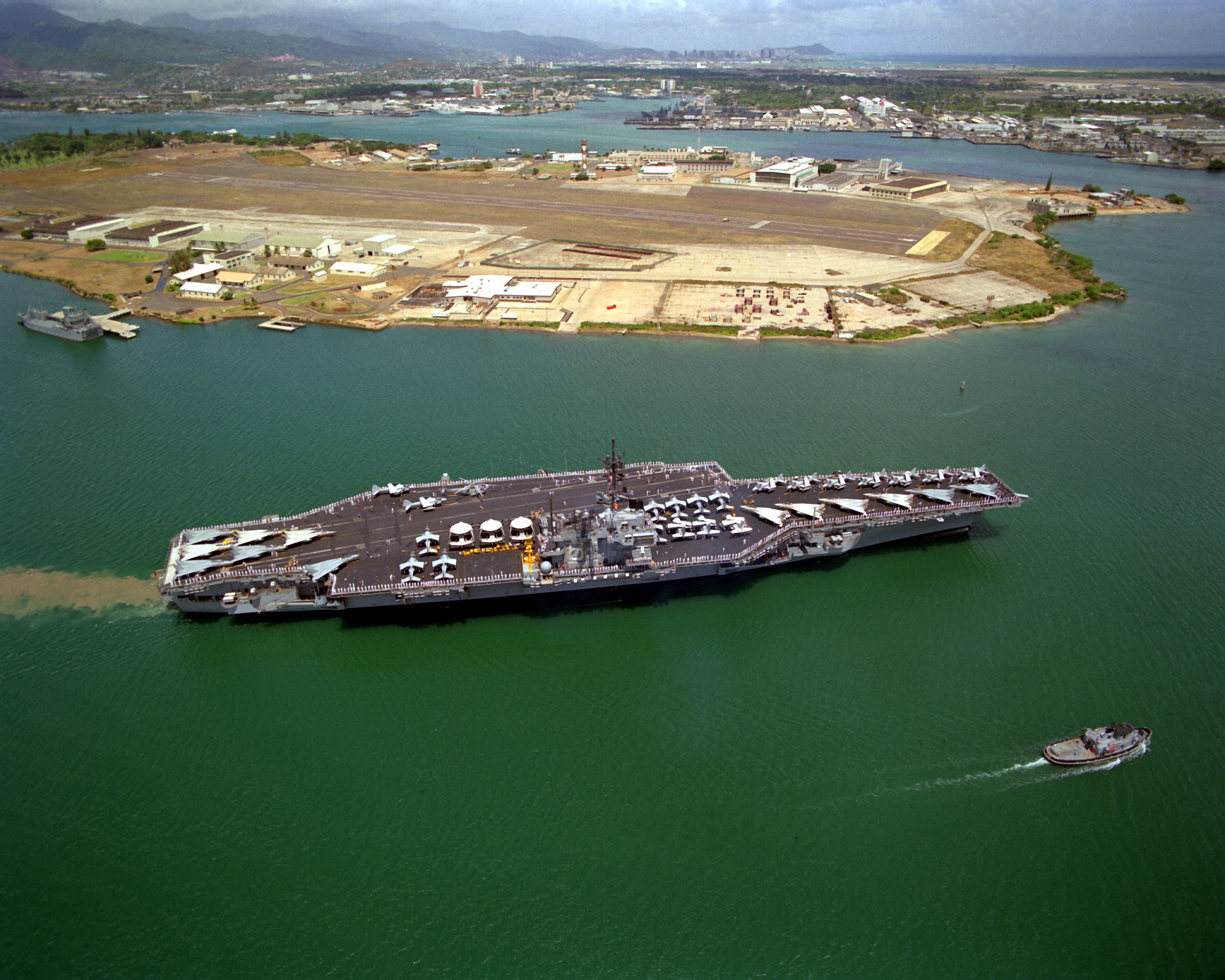 1589k | Tuskegee (YTB-806) escorts USS Ranger (CV-61) around the north end of Ford Island at Pearl Harbor, HI., 1 June 1991. Ranger was stopping off at Pearl Harbor while en route to her home port after returning from deployment in the Persian Gulf during Operation Desert Storm.