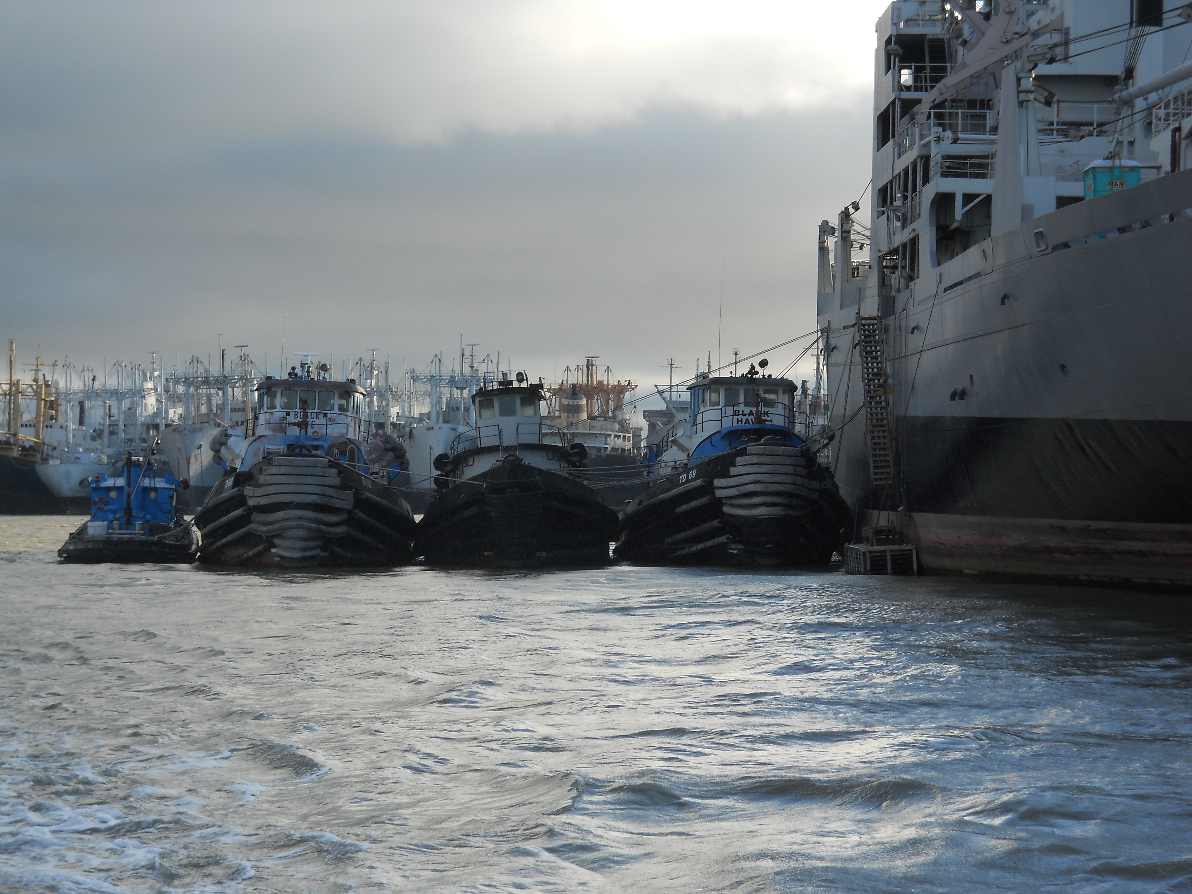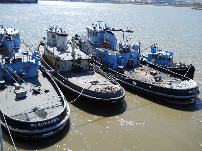 125k | Ex-YTL-434 in service for the Maritime Administration at Suisun Bay, Benecia, CA. moored starboard side to with other tugs at the reserve fleet. The three larger tugs are the MARAD tug Blackhawk, ex-Chilkat (YTM-773) and the MARAD tug Black Kite | Photo by Jason Loger | |