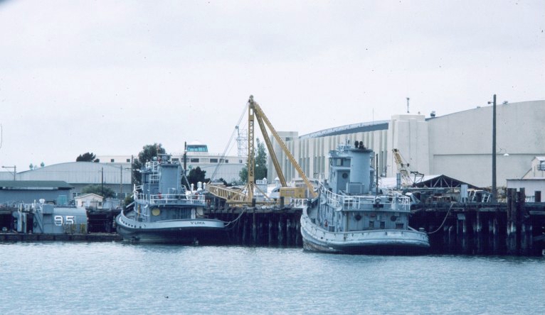646k | Yuma (YTM-748) and Owatonna (YTM-756) at Naval Supply Center, Oakland, CA. being readied for naval service in September 1964. The tug Mazapeta (YTM-181) is aft of Owatonna. File Name: YTM 756 01, Navy Photo, September 1964. |